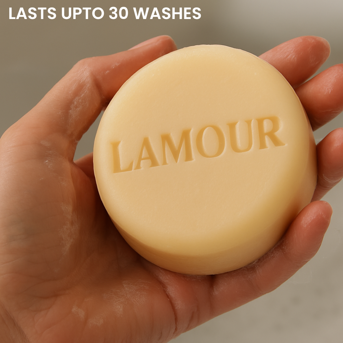 One LAMOUR bar replaces three full-size shampoo bottles! Saving you money and space. Formulated in Paris with Best Quality Ingredients that works for Pakistani Hair 🌿 Imagine running your fingers through visibly fuller, shinier, salon-soft hair after every wash! No tangles, no breakage just GLOSSIER & FULLER HAIR ✨ See visible 20% more volume after your first wash or we’ll 100% refund your money. Join 10,000+ happy customers already obsessed with LAMOUR 🔮